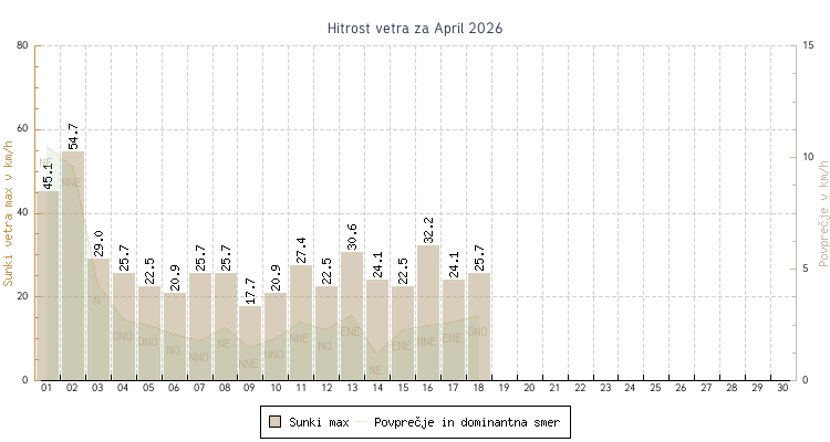 - Maksimalni sunek vetra : 54.7 km/h dne 02 ob 10:45