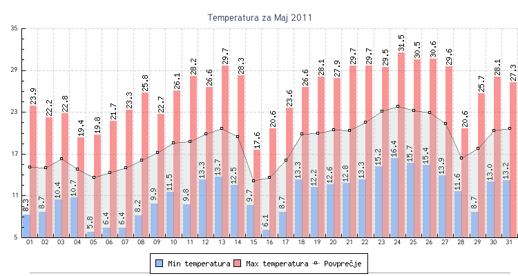 - Maksimalna temperatura : 31.5 °C dne 24 ob 14:50