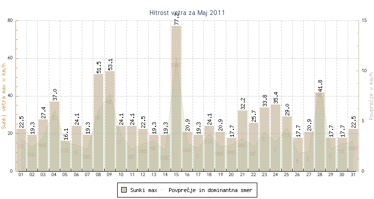 - Maksimalni sunek vetra : 77.2 km/h dne 15 ob 14:55