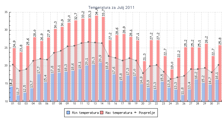 - Maksimalna temperatura : 34.0 °C dne 13 ob 14:55