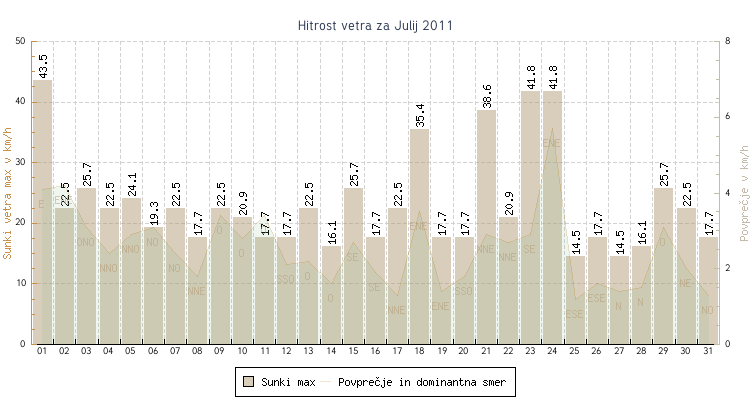 - Maksimalni sunek vetra : 43.5 km/h dne 01 ob 21:45